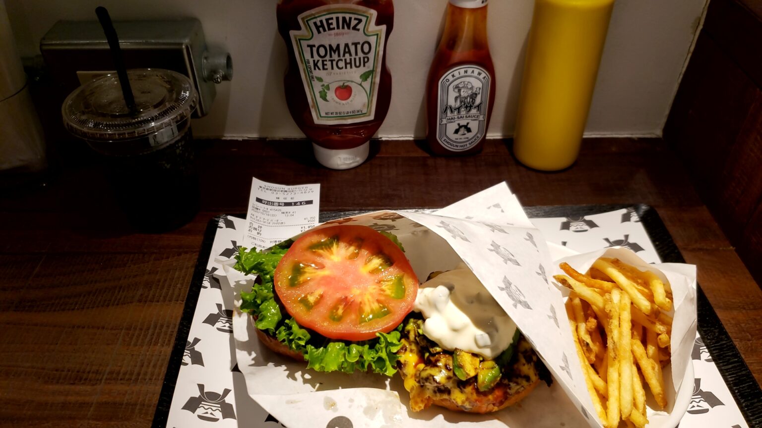 新宿駅の東口からでてアルタ方面に移動、 横断歩道を渡りまっすぐ大通りも渡る。 左から3番目の歌舞伎町サクラ通りに入る。 まっすぐ進むと左手に提灯に侍の絵が描かれた 店がショーグンバーガーになっている。 店の前に人が並んでジュースを 飲んでいるので結構目立つ。 店内は白い壁に明るいライトで 右が調理場、左がカウンター席になっている。 奥に少量のテーブル席がある、ほぼカウンター席 休日の昼に入店、満員状態で店の中、外に 8人ほど並んでいる人がいた。 またテイクアウトで来る人もかなりいた 店内、店外共に混んでいたが、 常に人混みがある新宿の土地柄か 近くでも意識せずに過ごすことができ、 思ったより食事に集中できた。