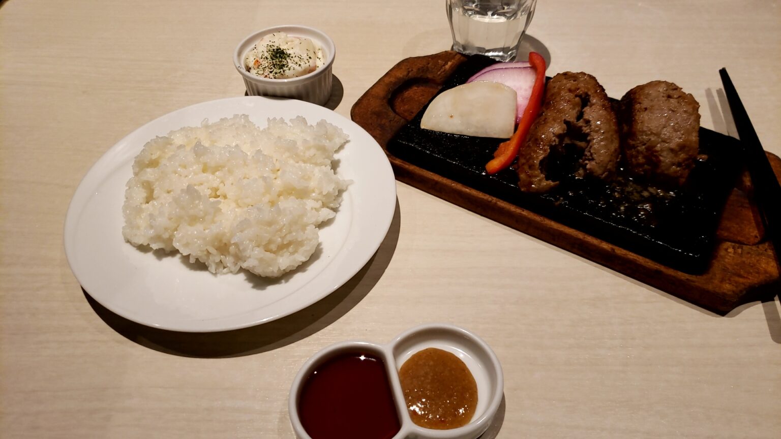 次に肉、ハンバーグは和牛ハンバーグのようにふわふわです、うまい、肉汁がしっかり出ているし食べごたえもある、ソースは甘辛のほうが美味しかったから2つ目はあまりつけなかった。